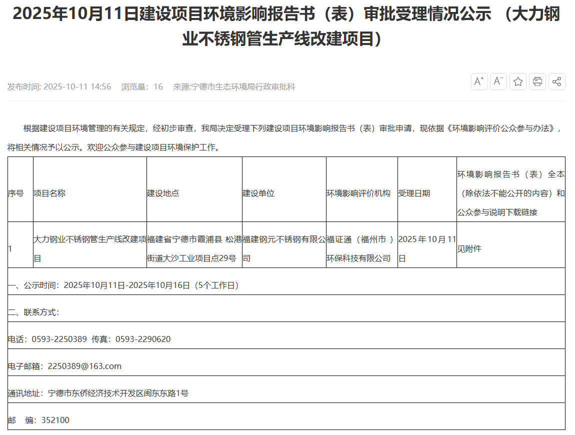 2025年10月11日,宁德市生态环境局受理福建大力钢业有限公司大力钢业不锈钢管生产线改建项目环境影响评价报告表并对外进行公示,公示时间:2025年10月11日-2025年10月16日(5个工作日)。