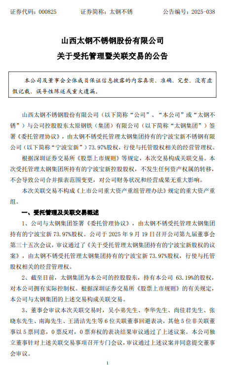 2025年9月19日,据《山西太钢不锈钢股份有限公司关于受托管理暨关联交易的公告》称,“山西太钢不锈钢股份有限公司(以下简称“公司”、“本公司”或“太钢不锈”)与公司控股股东太原钢铁(集团)有限公司(以下简称“太钢集团”)签署《委托管理协议》,由太钢不锈受托管理太钢集团持有的宁波宝新不锈钢有限公司(以下简称“宁波宝新”)73.97%股权,行使与托管股权相关的经营管理权。根据深圳证券交易所《股票上市规则》等规定,本次交易构成关联交易。本次受托管理太钢集团所持有的宁波宝新控股股权,不发生任何资产权属的转移,不会导致公司合并报表范围变更,对公司财务状况和经营成果无重大影响。”