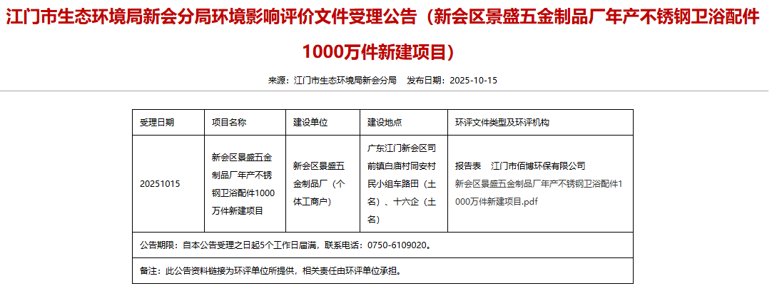 2025年10月15日,江门市生态环境局新会分局受理新会区景盛五金制品厂年产不锈钢卫浴配件1000万件新建项目环境影响评价报告表并对外进行公告,公告期:5个工作日。